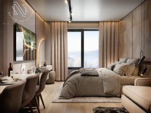 Apartmani će se nalaziti na trećem i četvrtom spratu aparthotela Snježna dolina Jahorina, oba su veličine 32,34m2 koji rasporedom imaju: